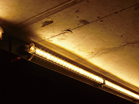 このLEDユニットは,長さは約1300mmと蛍光灯FLR40Wと同程度の全長で,1ユニット辺りの消費電力は10W程度でありながら既存のLEDユニットに比べて出力も高く,効率的に素子を発光させている。また,接続する電源装置の種類にもよるが,一つの電源装置から7~9本のユニットを直列接続することが可能であり,このユニット単体で防湿構造を確保している。