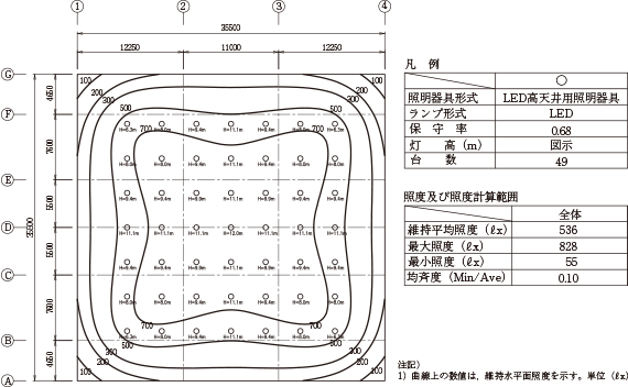 床面照度は既設照明と同台数の49台にて500ℓxを確保した。照度分布を図3に示す。従来は,セードと,400W水銀ランプとの組合せで25台,360W高圧ナトリウムランプとの組合せで24台により照明していた。 そこで,消費電力は,従来が合計19375W,改修後は合計11025Wであり,約40%の省エネとなった。