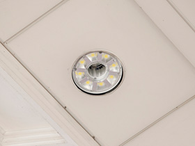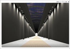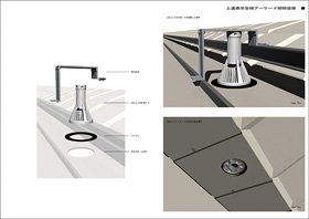 上通商店街のアーケード照明は,埋込式ダウンライト(MF250W)を使用している。調光可能タイプのレディオック ハイベイ ラムダ™(LEDioc HIGH-BAY Λ™)200Wと天井裏の梁に固定する特注の取付金具との組み合わせで,既設の埋込穴に入れるかどうか,検討を行った。現地調査しながら作図した取付金具の設計図面と既設構造物の寸法(既設のダウンライト枠:ø350,パネル:約1,000×約1,000)を基に,3DCGでイメージパース図を作成した(図3,図4)。レディオック ハイベイ ラムダ(以下,略す場合は「ラムダ」と表記)を埋め込むことで,昼間の景観や周辺の雰囲気を調和できる(図5,図6)。