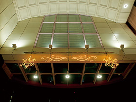 既設の照明器具との同じ台数で取り替えることになったが,両サイド照明方式の採用,3階部分までの高さの確保,及び調光制御により,照度を保ちながら,眩しさを感じさせない。