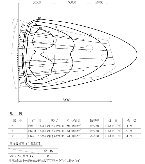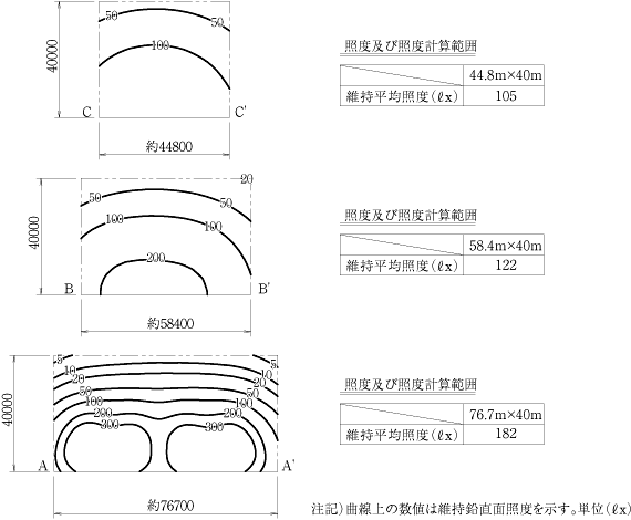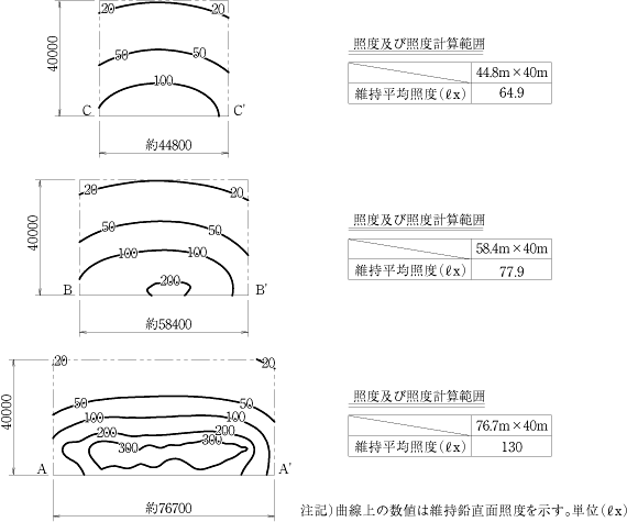 既存照明設備は,メタルハライドランプ1kW用投光器が33台,打席屋根の上に均等に配置されたものである。この既存設備について推定の照度検証を行った結果,維持水平面照度は約60ℓx,維持鉛直面照度は50m先で130ℓx,最先端部で65ℓxという計算結果であった(図1,2)。