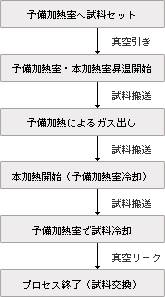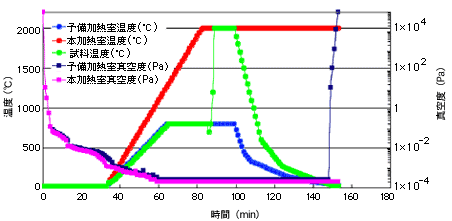 - 予備加熱室,主加熱室への搬送機能により,予備加熱室で不純ガスを放出させ,予め2000℃に加熱した主加熱室に瞬時に搬送する為,予備加熱室で加熱された800℃の試料は数分で2000℃に到達し,且つクリーンな状態で加熱することが可能である。