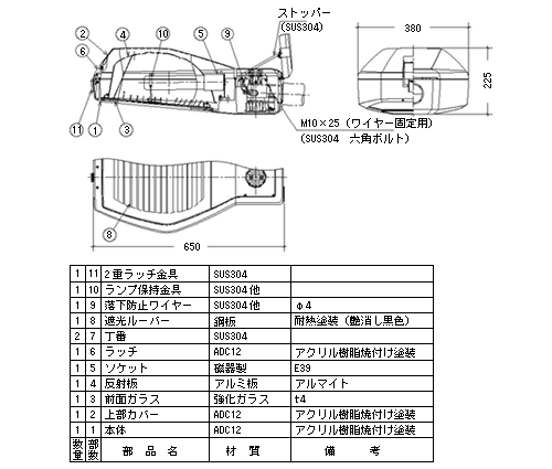 照明器具の光学系は,海上面への光漏れを抑え,かつ車道方向への配光制御を妨げないように低反射処理を施したルーバーを反射板内に内蔵した。ルーバーは,角度,形状,枚数を設計し,各方向へ適切な配光制御ができるよう検討を行なった。また,海上からの見え方,および海上方向への光の散乱を制御することを考慮し,下面フラットガラスとした。照明器具図を図4に示す。