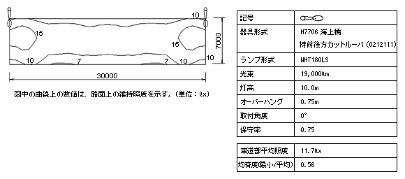 照明器具と道路の位置関係は図3の通りである。照明器具の配光は,路面の均斉度の良い状態を得るとともに,海上橋であることを考え,海上面への光漏れを厳しく制限する必要がある。