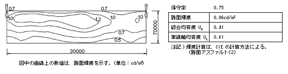 以上の条件を満足する開発器具による照度分布図を図5に,路面輝度分布図を図6に示す。また,海面上漏れ光の(初期水平面)照度分布図を図7に示す。