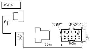| 水平面照度分布 | ビルA,B,Cの各9点 | 18:30 | |