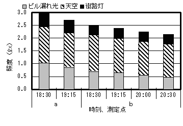 18時30分時点での水平面照度の実測値はa点で3.0ℓx程度だった。これは街路灯,ビル窓,天空からの照度を合計した値である。次に,写真測光による各成分(街路灯,ビル窓,天空)照度の時間変動を図4に示す。