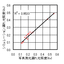 シミュレーションによるビルからの漏れ光照度と,写真測光によるビルからの漏れ光照度が一致するかの検討を行った。その結果を図5に示す。シミュレーションと実測値は概ね一致し,窓から外へ漏れる光が推測できていると考えられる。