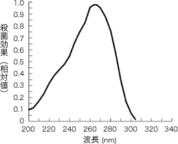 光といってもどんな光でも効果があるのではなく,殺菌に作用する波長範囲があって,この光の波長と殺菌作用との相関関係を示すと図15)のようになり,UV-Cの領域(100nm~280nm)のUVが殺菌作用を示し,特に260nm付近のUVが最大に作用する。