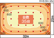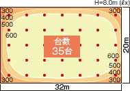 図3は32m×20m,高さ8mのエリアで従来型HID(メタルハライドランプ)400W+セードの照度分布(維持)である。図4は,今回開発したLED高天井器具レディオック ハイベイ ラムダ(広角配光)の図3と同設定での照度分布(維持)である。図3と図4の比較により,目標とする結果が得られている。