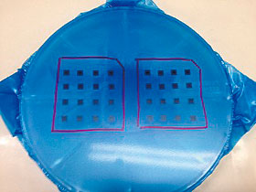 (株)信光社製のNb(0.05wt%):SrTiO₃単結晶(サイズ15×15×0.5mmt,面方位(100))にPtをArガスRFスパッタリングにより2mm□のパターンに厚さ10nm成膜し,3mm□にダイシングした。ダイシング後の個片を図1に示す。