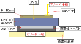 Nb:STOとショットキー接合をなす金属はAuとPtがある。両金属ともに仕事関数が大きく化学的に安定であり,ショットキー接合自体には問題ないが,AuはSTOとの密着性が小さくAuワイヤボンディングによる接合ができないので,ショットキー接合に用いる金属はPtを使用することにした。電極の形状はPtを透過した光をSTOに吸収させるため薄膜とし,形成方法はスパッタリングを用いた。