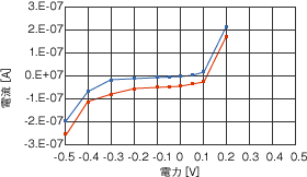 STOフォトダイオードの電流電圧特性を図4に示す。電流電圧特性はダイオード様の特性を示しているが,整流効果は弱い。受光面に紫外光を入射することによって電流値が光電流の分だけシフトしており,フォトダイオードとして機能していることが確認できる。また,-10mV印加時の電流値から内部並列抵抗は21MΩであると推定される。