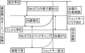 受光面であるPt/Nb:STO界面のバンド構造は,図5のような状態になっていると考えられる。このような界面にNb:STOのバンドギャップエネルギーより大きなエネルギーを持った光子が入射すると,価電子帯にある電子が導電帯に励起される。バンドギャップに勾配があるところで励起された電子は,そこにある電界で加速され接合部から離れていく。これがSTOフォトダイオードの出力電流として測定される。したがって,STOフォトダイオードは原理的にはNb:STOのバンドギャップエネルギー(3.2eV)以上のエネルギーを持つ光子にのみ感度を持つ。3.2eVのエネルギーを持つ光子の波長はおよそ390nmであるので,STOフォトダイオードは390nm以下の光にのみ感度を持つと予想される。
