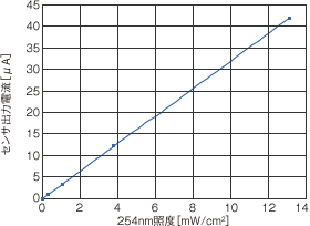 STOフォトダイオードに照射する光量を変化させた場合の出力電流の変化を図7に示す。光源は岩崎電気製オゾンレス水銀ランプを用い,ランプより5cmの位置にフォトダイオードを設置し,受光面全体とその周縁部に光を照射した。光量の調節はフォトダイオードの直前に置いたメッシュフィルタを使用し,照度の測定にはORC製照度計UV-M03を使用した。STOフォトダイオードの出力電流は照度計で測定した254nm照度に比例していることが確かめられた。オゾンレス水銀ランプの光のほとんどは254nmの輝線に集中しており,可視光は紫外領域での発光に比較して10%以下の強度しかないため,STOフォトダイオードの出力はオゾンレス水銀ランプの254nm輝線の強度の良い指標になると考えられる。