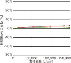 STOフォトダイオードの耐久性を図9に示す。光源には岩崎電気製オゾンレス水銀ランプを使用し,大気中で受光面全体とその周縁部に連続的に27mW/cm²(254nm)の光を照射し続けた。感度の測定には岩崎電気製オゾンレス水銀ランプを使用し,ランプより5cmの位置にフォトダイオードを設置し受光面全体とその周縁部に光を照射し,照射開始から1分後の値を測定値とした。STOフォトダイオードは,オゾンレス水銀ランプの光を継続的に照射し累積線量が150000J/cm²にまで達してもほとんど感度に変化はなく,紫外線の連続曝露に対して耐性があることを確認した。
