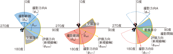 ここで求められた新視線軸を用いて撮影方向φm,φm+1それぞれの画像に対して視線軸変換を行い,変換画像を組み合わせる(以降,視線軸合成と記す)ことで等価光幕輝度の計算範囲の光の情報が補完さる。補完された画像を用いることで,任意の水平方向の等価光幕輝度を算出することができる。