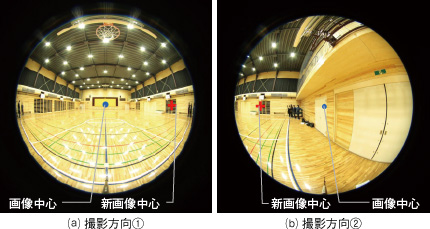 図8に撮影画像を示す。(a)は撮影方向①,(b)は撮影方向②の撮影画像を示す。図中の青丸は画像中心,赤の十字は新視線軸に対応した新画像中心を示す。