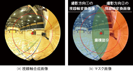 図10に合成画像を示す。(a)は視線軸合成画像,(b)は範囲を示すマスク画像を示す。(b)中青部分は撮影方向①の変換画像,赤部分は撮影方向②の変換画像,緑部分はそれぞれの重複部分を表す。(b)中,緑の重複部分の合成にはさまざまな方法が考えられるが,今回はグレア評価方向に近い撮影方向の変換画像を用いた。(a)を見るとグレア評価方向の画像が再現されている。