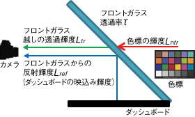 フロントガラスによる影響を,透過による「減光(透過)」と,ダッシュボードの映り込みによる「反射」の二つと仮定する(図5)。
