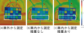写真測光と動画測光のそれぞれの図を比較すると,図11(a)下部のダッシュボードの映り込みを除けば近似した輝度分布となっていることが確認できる。よって,提案した補正方法を用いることで,車内からの動画測光で車外からの写真測光と同等の輝度分布が取得できるということが確認できる。