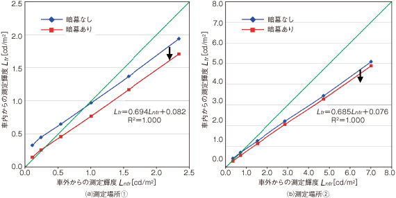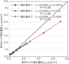 図7は,各測定場所における色票(図6中 破線部)の輝度測定結果である。図は,式(1)の関係を求めるため縦軸を車外からの測定輝度Lntr(図6(a)),横軸を車内からの測定輝度Ltr(図6(b))としている。
