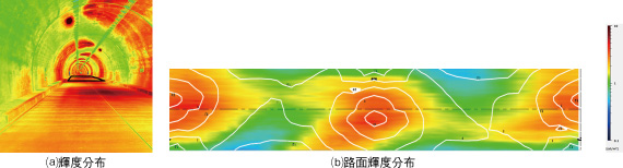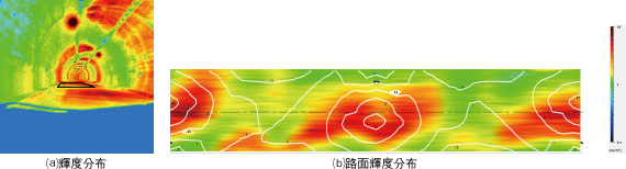 図より高い輝度が規則的に分布していることが確認できる。これは,照明器具の設置場所に合わせて高輝度部分が出現しているためである。また,一部,途中に高輝度部分や,右端に低輝度部分があるが,高輝度は非駐帯で補助照明が追加設置されている場所,低輝度部分はトンネルを抜け,照明器具がなくなった場所である。このように,全路面輝度分布から走行区間全体の輝度変化を把握することができる。つまり,照明器具の不点灯や劣化など路面輝度が低下する部分を容易に特定することができる。