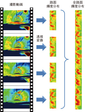 最後に,動画輝度測定による全走行区間の路面輝度測定について検討する。3.2.1節で示したように,輝度画像から透視変換を行うことで路面輝度分布を取得することができる。そこで,図12に示すように撮影された動画のフレームごとの路面輝度分布を作成し合成することで走行区間すべての路面輝度分布を作成することができる。