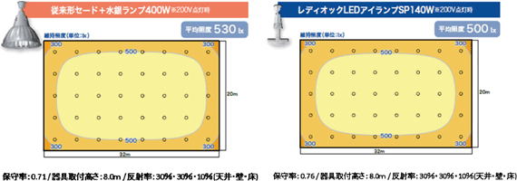 水銀ランプ400W(ランプ+セード)と同等の配光性能を実現する。図2に両者の照度分布図の比較を示す。