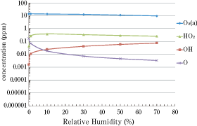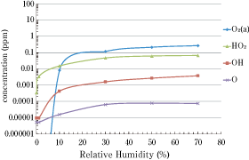 - 相対湿度(水分の存在)によって,OHラジカルなどの高活性な活性酸素種は顕著に増加する傾向にあることがわかった。