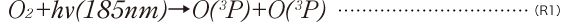 活性酸素種はUVランプから放射されるUV光とO₂との反応によって生成される。UVランプから放射される波長185nmの真空紫外光がO₂に吸収されて,2個の基底状態の原子状酸素(O(³P))が生成される。