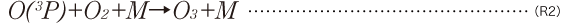 ここで,反応式(R2)のMは,Third body(第三体)を意味する,すなわちオゾン(O₃)生成は単純に原子状酸素と酸素分子が反応するわけではなく,三体衝突反応であることを意味している。