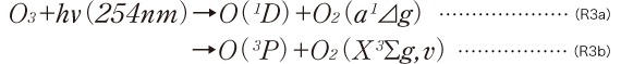 反応式(R3a)のO(¹D)は励起状態(基底状態よりもエネルギーが高い状態)の一重項酸素原子を,O₂(a¹⊿g)は励起一重項酸素分子をそれぞれ意味しており,非常に高活性な状態,すなわち活性酸素であり,反応(R3a)の収率φ=0.9である。ここで,反応式(R3b)のO₂(X³Σg, v)は,三重項状態の酸素分子である。