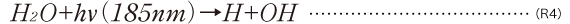 さらに水分(H₂O)が存在すると,次式の反応により,水素原子(H)とヒドロキシラジカル(OH)が生成する,