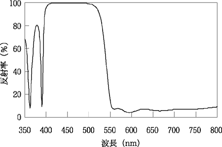 また,図3には,ランプ光色が分かり易いように色度座標上に色度範囲をプロットした。図4は,薄膜ブルーミラーの分光反射率特性である。