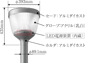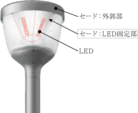 本器具は図1に示す通り,ポール挿入部上部にLED電源装置を内蔵している。電源装置を内蔵するにあたり,いかなる方向からの水の飛沫によっても有害な影響を受けず(防沫形),1.0mmより大きい固形物が浸入しない保護等級(IP44)を実現した。