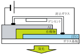 図1に,有機EL(ボトム・エミッション型)の概略図を示す。有機ELは,発光に寄与する有機材料を陽極と陰極で挟んだ,非常にシンプルな構造を有する素子である。特性を向上させる為,各特性を担う(発光層,正孔注入層,正孔・電子輸送層等)有機材料を,数10nmの膜厚にて積層させるのが一般的である。また,有機材料は水分・酸素の影響を受けやすい(劣化しやすい)為,封止ガラスを用いて,内部に吸湿剤(デシカント)を設置し,封止材(主に紫外光(UV)にて硬化する材料)にて真空封止や不活性ガス封止が行なわれる。出来上がった素子に直流電圧(5V程度)を印加すると,陽極(ITO)から正孔,陰極(Al)から電子が有機層内に注入され,上記各層を介して発光層に到達し,再結合・励起し,基底状態に戻る際に発光層の材料に応じた波長で発光する。