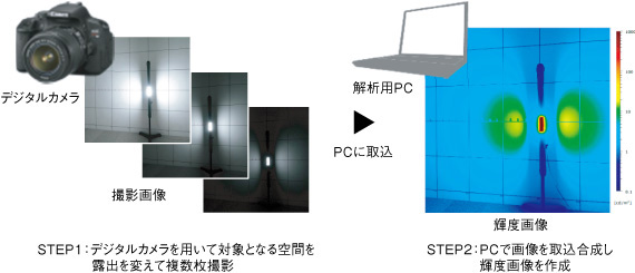 路面輝度を含む,空間全体の輝度分布は,部分輝度計を用いなくとも,デジタルカメラを用いて簡易的に測定が可能であることが知られている。写真測光といわれるこの方法は,あらかじめ校正したデジタルカメラで測定対象となる空間の写真を,露出を変えて複数枚撮影し,パーソナルコンピュータを用いて合成することで輝度画像を得ることができる(図1参照)。近年,デジタルカメラおよびパーソナルコンピュータの高性能化により,容易に高解像度な輝度分布の解析が可能になってきている。先に筆者らは,光環境評価システム「QUAPIX™」2),#1という,写真測光法を用いて,より速く簡単に空間の輝度分布を取得することのできるソフトウェアを開発している。本ソフトウェアを活用することで,これまで困難であった,「平均路面輝度・輝度均斉度」の実測評価が可能になるものと考えられる。