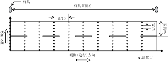 図2は,CIE30.23)に示された逐点法による路面輝度の計算点である。路面輝度の計算は,はじめに各計算点の水平面照度を計算し,観測者と計算点との位置関係から輝度換算係数を求めて算出する。したがって路面輝度の実測は,この各計算点の輝度を測定し,その平均輝度・輝度均斉度を求めるのが望ましい。