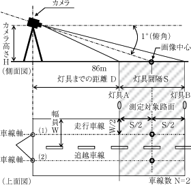 図6は,QUAPIXにより路面輝度を測定する場合のカメラと測定対象路面との位置関係を示したものである。図に示すように,カメラは測定対象区間の車線軸上に設置する。さらにカメラの画像中心は車線軸上の灯具間隔S/2の位置になるようにする。このときのカメラから灯具までの距離Dおよびカメラ高さHは,カメラの俯角が1°となるように設定する。