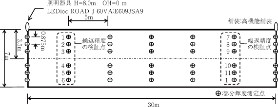 実験は,株式会社つくばイワサキの構内実験道路(幅員W=7(m))にて実施した。図9は照明器具の設置位置を示したものである。照明器具は,取付間隔S=30(m),取付高さH=8(m)の位置に,LEDioc® ROAD J® 60VAを設置した。