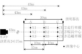 表2に実験で使用した,カメラおよびレンズの型式と撮影時の画素数,レンズ焦点距離の設定値を示す。図10は,カメラの設置位置および画像中心位置を示したものである。本実験では,カメラの俯角による路面輝度の測定差を検証するため,画像中心(図11参照)を図10に示す9点(A1-C3)設定し測定を実施した。カメラは,A1-C3の各点から43m手前の位置に設置した。なお,カメラの俯角は,画像中心をA2とした場合は0.8°,B2とした場合は1°,C2とした場合は1.3°となる。