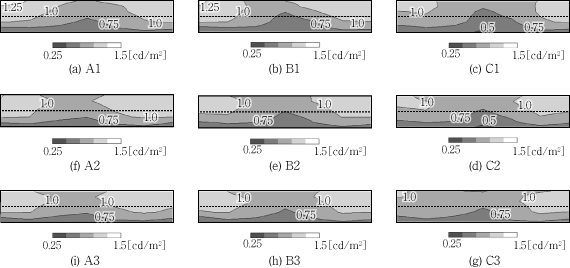 図12は,スポット輝度計による路面輝度の測定結果である。また,図13に,画像中心をA1-C3の各点とした場合のQUAPIXによる路面輝度の測定結果を示す。