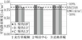 | 平均路面輝度 | 総合均斉度 | 車線軸均斉度 | ||||