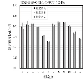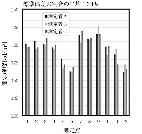 図15は,図9に示す繰り返し精度の検証点の輝度を,3名の測定者がスポット輝度計とQUAPIXとで測定した結果を比較したものである。図よりスポット輝度計を用いた場合では,各測定点の標準偏差の割合(平均値からのバラつきの割合)の平均は,6.4%であったのに対し,QUAPIXでは,2.4%となり測定者によるバラつきが1/3程度少なくなっていることが確認できる。このことは,QUAPIXが測定者によらず繰り返し精度の高い路面輝度測定が可能であることを示している。
