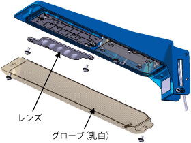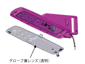 また,従来品ではレンズとグローブがそれぞれ別部品となっていたが,新きょう体ではグローブ兼レンズ(一体形状)とすることで,部品を1つにまとめ,部品点数及びそれらを固定するためのねじの削減が可能となった。