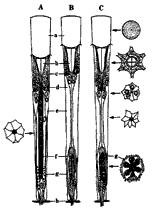 昆虫の眼は複眼と単眼に大別され,多くの昆虫は複眼を有している。図1 6)はコガネムシの複眼を構成する個眼を示し,角膜レンズ,晶子体,虹彩色素細胞,網膜色素細胞,網膜細胞,感桿(ラブドム),毛細気管,基底膜などからなりたつ。Aは昼行性の種を示し晶子体を取り巻く虹彩色素細胞や網膜色素細胞が厚くなっており,感桿は細長くなっている。Bは昼-夜行性の種の暗順応状態を示し,虹彩色素,網膜色素細胞とも薄く短く光を通し易くしている。Cは明順応状態を示し,晶子体を取り巻く2つの色素細胞は厚く長くなっている。光は網膜細胞や感桿で電気エネルギーに変換され,信号は神経細胞を経て中枢に伝えられる。また,夜間活動性の昆虫を暗所に移すと暗順応が起こり,晶子体が内方へ露出し容易に光が透入する。暗順応状態では光瞳孔が現出してくるため複眼の外観より,夜間活動性か否か判別できる。