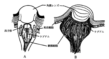 図2 7)は単眼の構造を示し,角膜レンズ,晶子体,感桿,網膜細胞より構成されている。Aはカメムシの成虫の頭部背面にある背単眼を示し,Bはチョウの幼虫の頭部側面にある側単眼を示している。背単眼は500~1000個の視細胞からなり,レンズを1つもっている。レンズ開口が大きいため低い照度の光を受容するのに適している。側単眼はハバチの幼虫では1個,チョウの幼虫では数個頭部側方にあり,チョウではある程度のパターン認識や色の弁別も可能で,ハバチやハマキガの幼虫では偏光の検出機能があることが知られている。