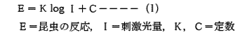 このような走光性が発現する最低照度はニカメイガでは 7.4×10⁻⁶~6.5×10⁻⁶ℓxと言われ,かなり低い。それ以上では,1式が成り立ち,昆虫の反応(E)は刺激光量(I)が大きければ大きいほど強くなるのが普通である。しかしながらこの反応にも限度があり,その限界を超すと走光性が逆転し,負の走光性を示すものと定位運動を停止する場合がある 9)。