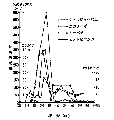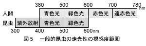 一般的昆虫の走光性の視感度は図5に示す如く,300~600nmの範囲で,人の眼の感度範囲より約100nm短波長側にシフトしている。